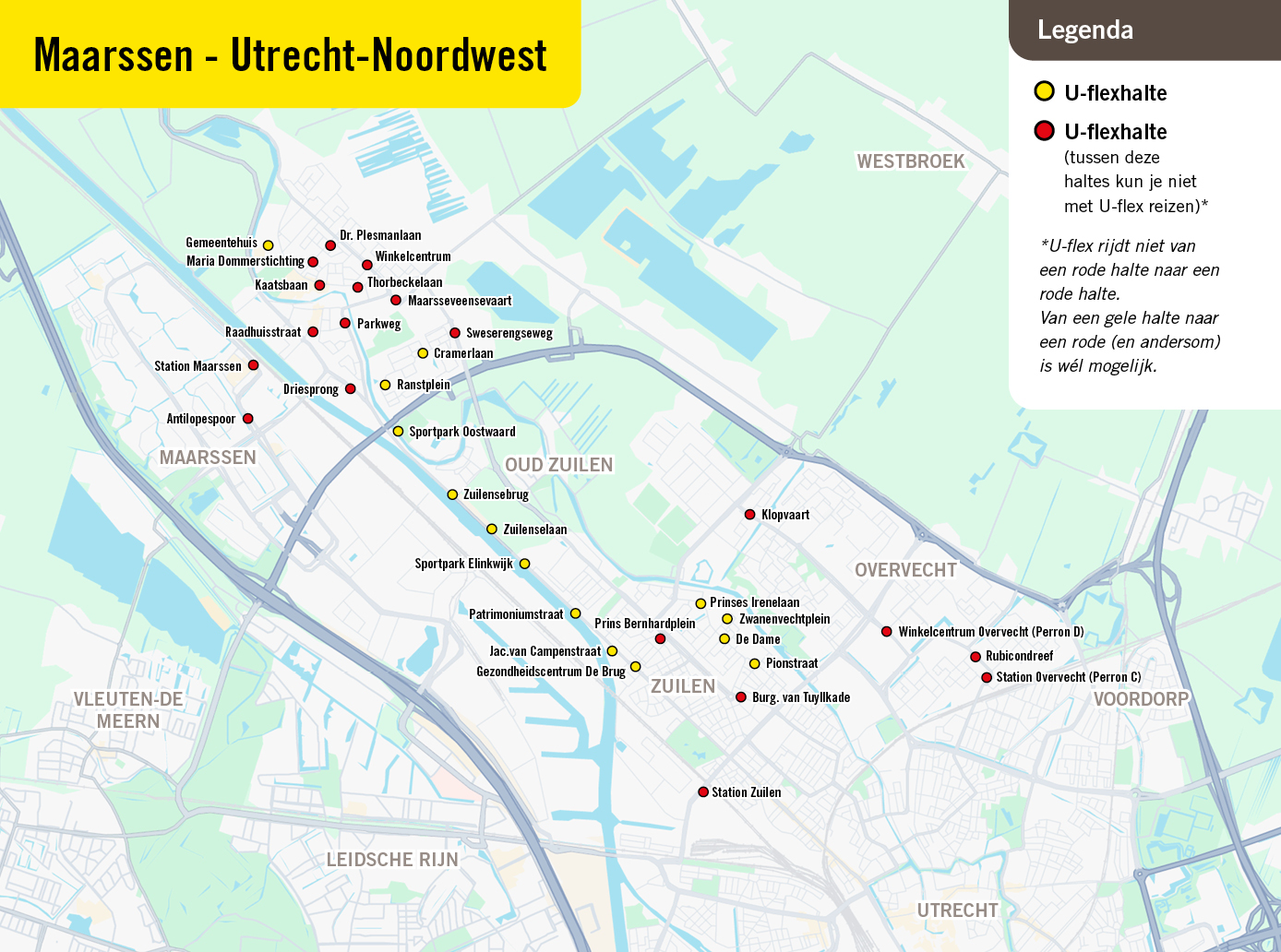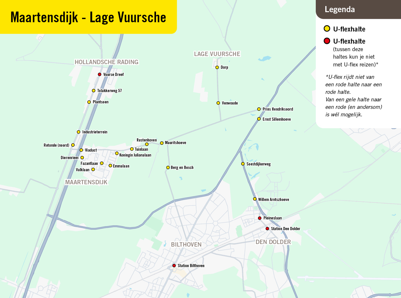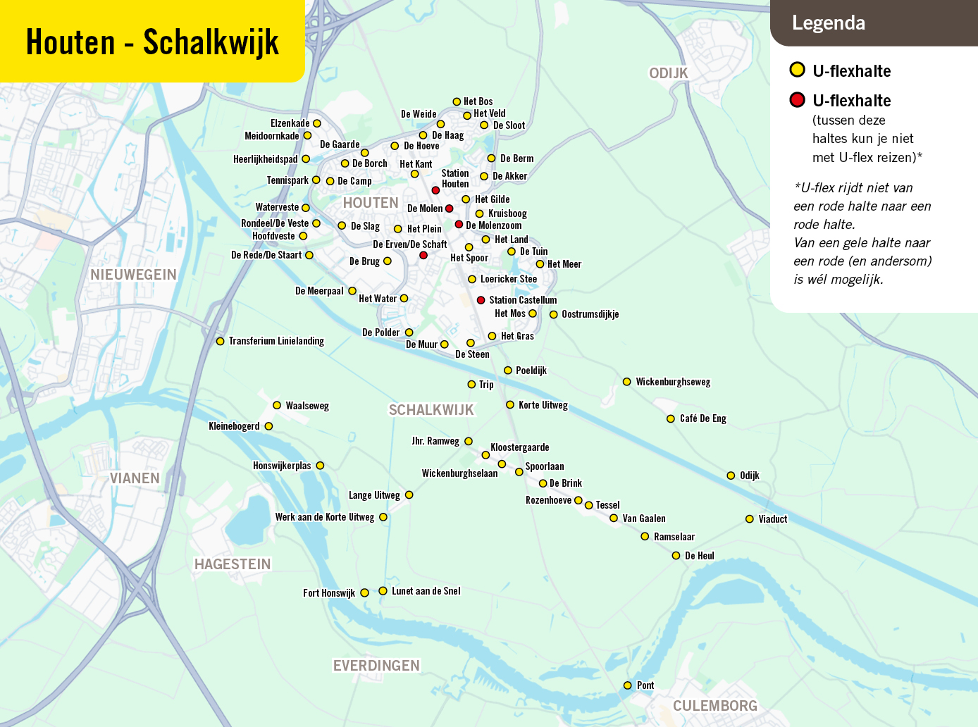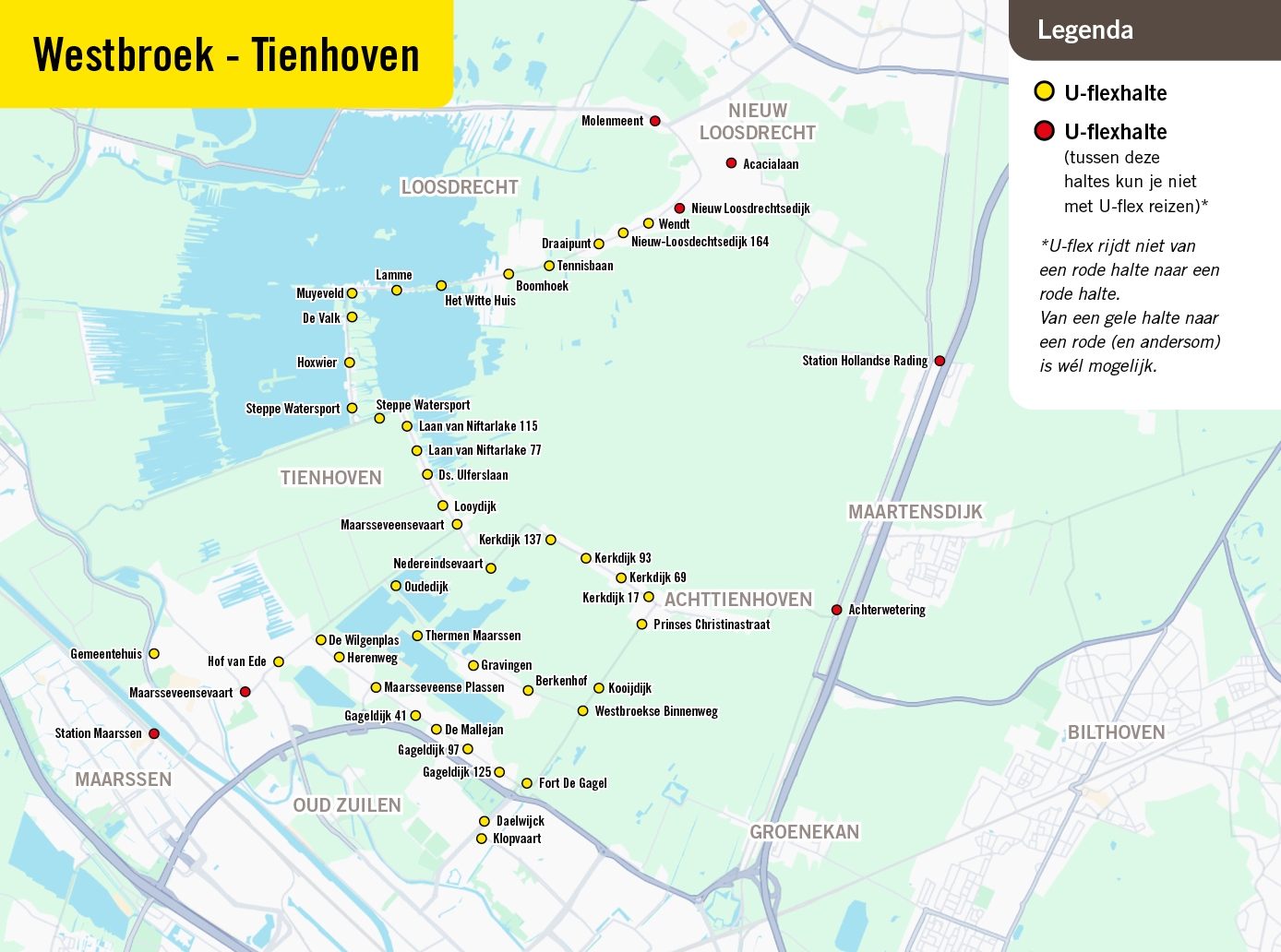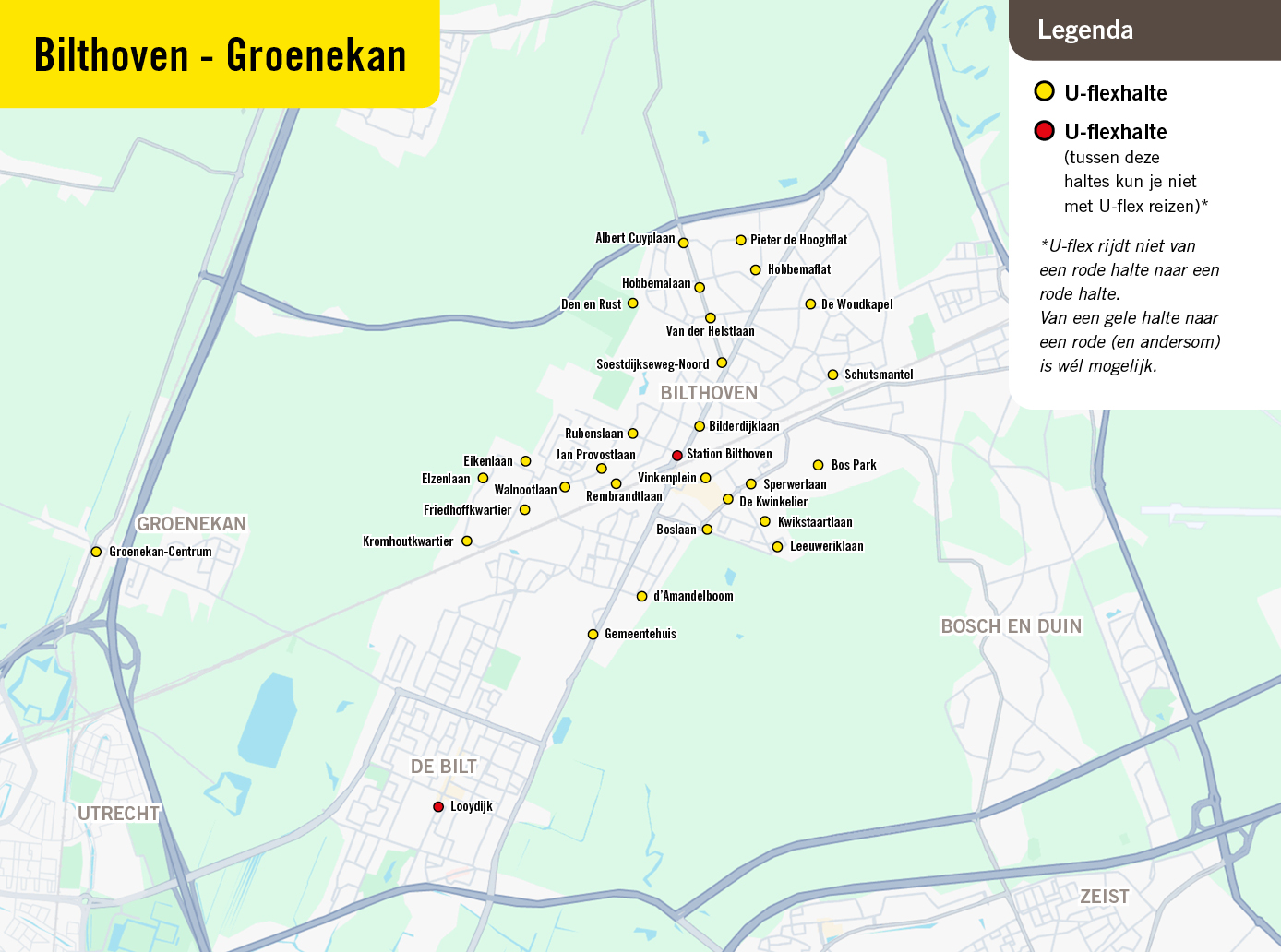 Vanaf 14 december 2025 is U-flex beschikbaar in meerdere gebieden in de provincie Utrecht. Door op onderstaande gebieden te klikken zie je tussen welke haltes U-flex beschikbaar is. U-flex rijdt in;